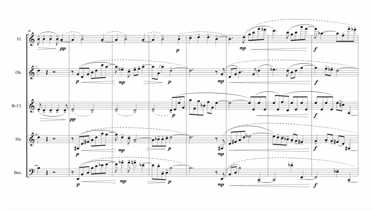 Flute, Oboe (doubling English Horn), Clarinet (doubling Bass Clarinet and Clarinet in A), Bassoon, and Horn in F