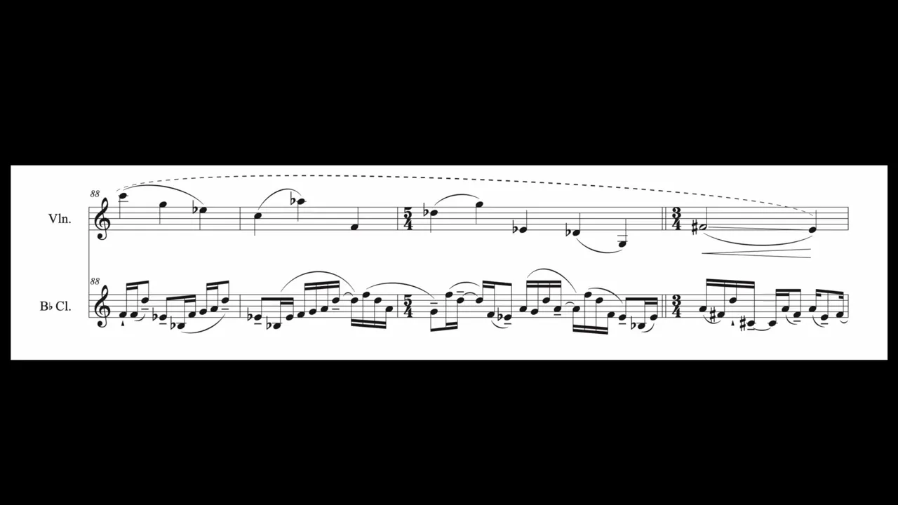 XIV. “Ground” A pairing of two favorite musical motions of mine: “pendulum” or "oscillating" music dominates the violin writing and a sort of “stride bass” is found throughout the bass clarinet part. Set in a fairly ambiguous mode (maybe just f-sharp minor?) this fairly substantial duo spans a range of affects from objective to sentimental.